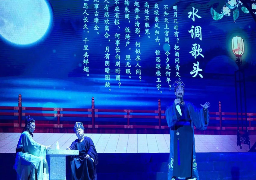 ▲国家一级演员、飞天奖获得者杜宁林老师和汕头演艺集团公司艺术总监、潮汕著名话剧演员赵曙光老师分别用普通话和潮汕话朗诵《水调歌头》。一轮明月,一壶美酒,娓娓道来中将思念化酒入愁肠。